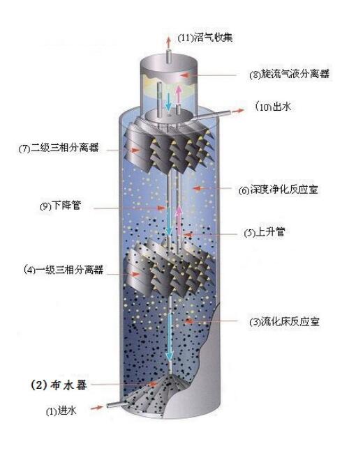 經(jīng)過調(diào)節(jié)pH和溫度的生產(chǎn)廢水首先進入反應(yīng)器底部的混合區(qū),并與來自泥水下降管的內(nèi)循環(huán)泥水混合液充分混合后進入顆粒污泥膨脹床區(qū)進行COD生化降解,此處的COD容積負荷很高,大部分進水COD在此處被降解,產(chǎn)生大量沼氣。沼氣由一級三相分離器收集。由于沼氣氣泡形成過程中對液體做的膨脹功產(chǎn)生了氣提的作用,使得沼氣、污泥和水的混合物沿沼氣提升管上升至反應(yīng)器頂部的氣液分離器,沼氣在該處與泥水分離并被導(dǎo)出處理系統(tǒng)。泥水混合物則沿泥水下降管進入反應(yīng)器底部的混合區(qū),并于進水充分混合后進入污泥膨脹床區(qū),形成所謂內(nèi)循環(huán)。根據(jù)不同的進水COD負荷和反應(yīng)器的不同構(gòu)造,內(nèi)循環(huán)流量可達進水流量的0.5-5倍。經(jīng)膨脹床處理后的廢水除一部分參與內(nèi)循環(huán)外,其余污水通過一級三相分離器后,進入精處理區(qū)的顆粒污泥床區(qū)進行剩余COD降解與產(chǎn)沼氣過程,提高和保證了出水水質(zhì)。由于大部分COD已經(jīng)被降解,所以精處理區(qū)的COD負荷較低,產(chǎn)氣量也較小。該處產(chǎn)生的沼氣由二級三相分離器收集,通過集氣管進入氣液分離器并被導(dǎo)出處理系統(tǒng)。經(jīng)過精處理區(qū)處理后的廢水經(jīng)二級三相分離器作用后,上清液經(jīng)出水區(qū)排走,顆粒污泥則返回精處理區(qū)污泥床。