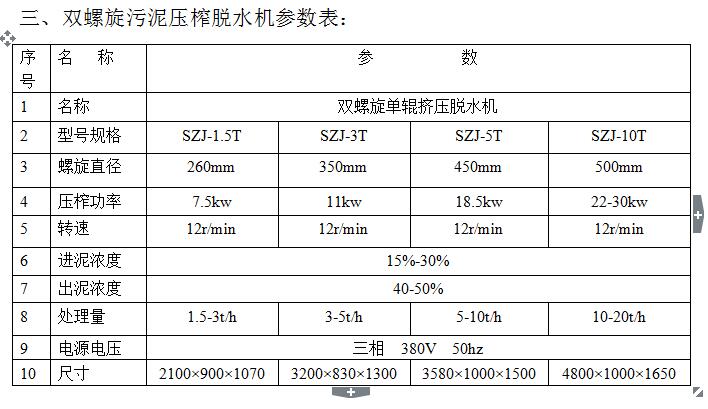 三、雙螺旋污泥壓榨脫水機(jī)參數(shù)表: