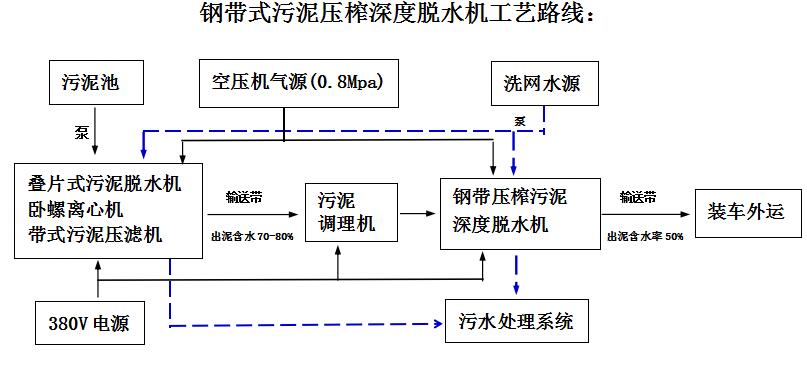 因?yàn)槠胀◣綁簽V機(jī),疊片式污泥脫水機(jī),臥螺離心機(jī)等設(shè)備的出泥含水率太高,一般在70%-85%之間,造成污泥的運(yùn)輸成本、接收處置成本過(guò)高。為了降低污泥的處置成本和提高燃燒值,就必須深度脫水,包括板框壓濾機(jī)(污泥濃度40%左右),再次的深度壓榨脫水。經(jīng)過(guò)雙網(wǎng)鋼帶壓濾機(jī)后的污泥濃度可以達(dá)到40%-52%之間,具體情況視污泥種類(lèi)而定。明顯降低運(yùn)輸及處置成本。