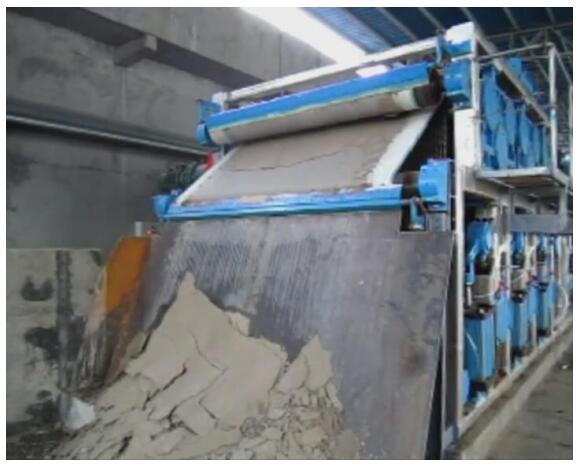 4、出泥濃度高達(dá)40-52%,出泥比板框式污泥壓濾機(jī)高10個(gè)百分點(diǎn)以上。而且含水率均衡,接收單位隨意抽檢污泥,其測(cè)得含水率數(shù)值是幾乎相同的。這一點(diǎn)是板框壓濾機(jī)做不到的。(因?yàn)榘蹇驂簽V機(jī)的進(jìn)泥是靠高壓泵加壓完成的,進(jìn)泥通道和中間污泥含水率高,靠濾布兩面含水率低,俗稱(chēng)為夾心餅干式結(jié)構(gòu))。