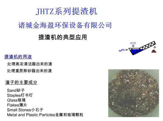 工作過(guò)程:渣水混合液中比重較大的渣粒在捕集穩(wěn)流板的作用下,下降沉積于蓄水箱(槽)底部,緩慢轉(zhuǎn)動(dòng)的輸送螺旋,不斷的將渣料沿傾斜的U型槽慢慢提升,隨著渣的向上提升,離開液面實(shí)現(xiàn)渣和水的分離,繼續(xù)(濾水)推移一段距離后,充分脫水后的渣粒經(jīng)U型槽上的排渣口排除,最終實(shí)現(xiàn)渣水的分離,而與渣分離后的水則從溢流口排出。