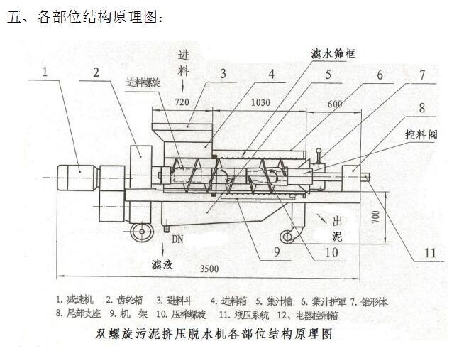 工作原理是由一組正向和反向螺旋輥的相對(duì)運(yùn)動(dòng)產(chǎn)生的相對(duì)的扭矩力來(lái)實(shí)現(xiàn)物料強(qiáng)制壓榨脫水的,工作原理就如同我們用兩只手?jǐn)Q衣服一樣。一個(gè)向前推進(jìn),一個(gè)向后反推,原料不斷進(jìn)入,在中間篩網(wǎng)區(qū)形成高濃擠壓脫水。螺旋按照一定的壓縮比減少物料運(yùn)行空間。物料在通過(guò)反螺旋后又進(jìn)入料塞壓力區(qū),由于出料口是被錐度壓力止推閥堵住的,污泥是在強(qiáng)制的推力下一被擠出脫水區(qū)的,所以污泥在這里得到了更進(jìn)一步的脫水過(guò)程。錐度止推閥的壓力是可以調(diào)整的,所以能很好的控制出泥的含水率。
