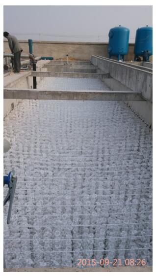 結(jié)構(gòu)包括池體,填料,布水裝置,曝氣裝置。工作原理為:在曝氣池中設(shè)置填料,將其作為生物膜的載體。待處理的廢水經(jīng)充氧后以一定流速流經(jīng)填料,與生物膜接觸,生物膜與懸浮的活性污泥共同作用,達到凈化廢水的作用。